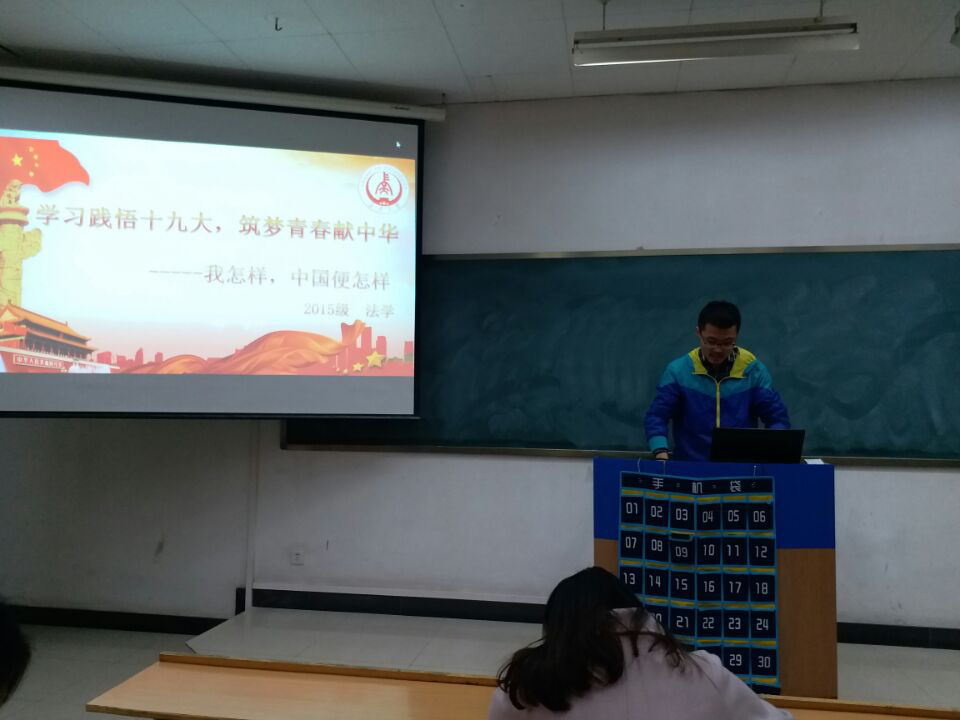 2017年11月18日18:00整,2015级法学班团支部在修远教学楼3206教室举行了以“学思践悟十九大,筑梦青春献中华——我怎样,中国便怎样”的主题团日活动。活动由宣传委员王雅主持进行。